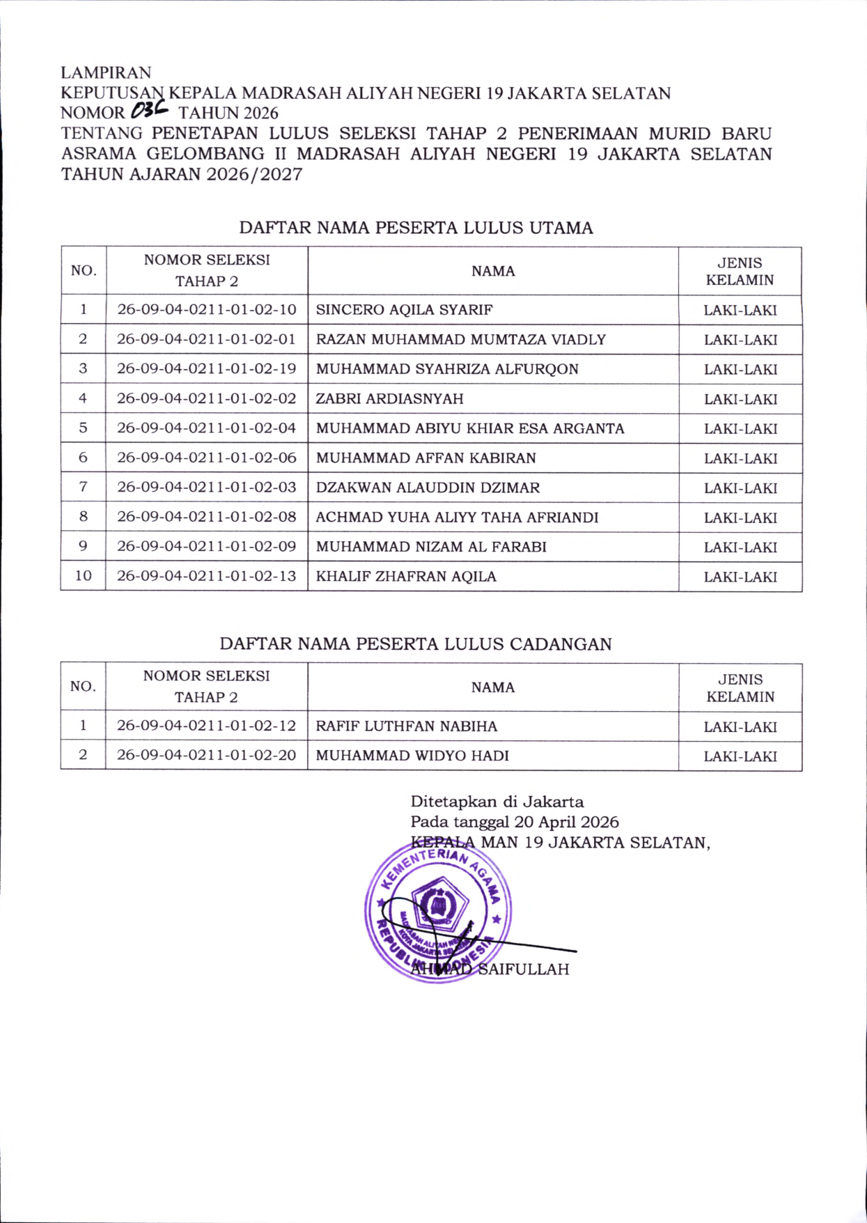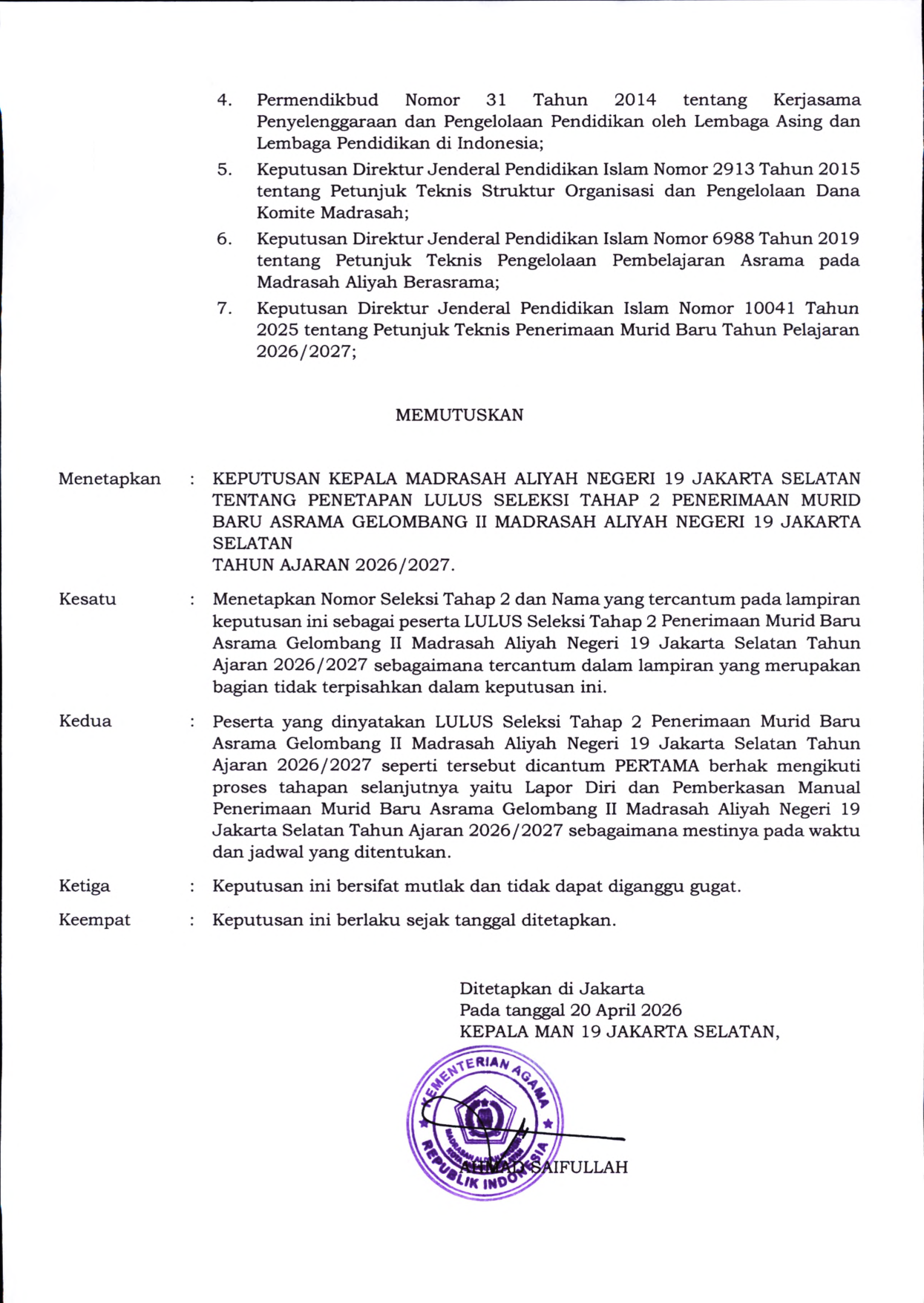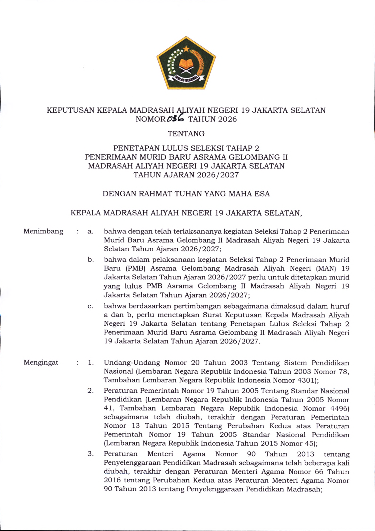 Pengumuman Seleksi Tahap 2 PMB Asrama Gelombang II Tahun Ajaran 2026/2027